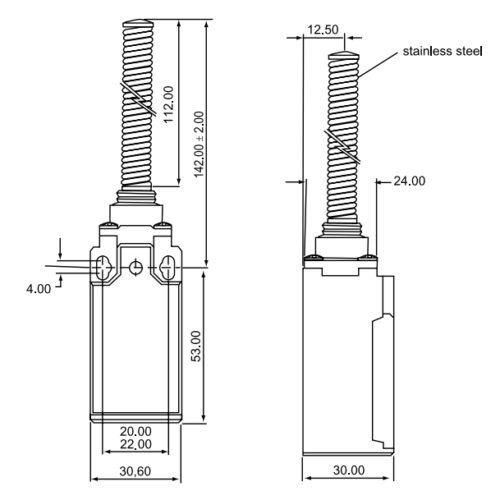 Chave fim de curso, Corpo Plastico, 1NA+1NF, 10A/250V, IP66, prensa cabo M20, acionamento tipo pino haste flexivel metalica