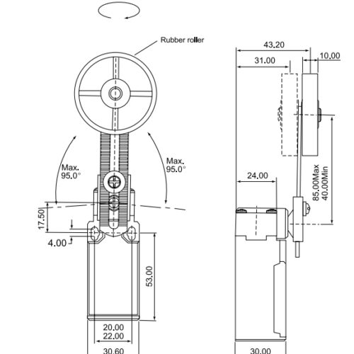 Chave fim de curso, Corpo Plastico, 1NA+1NF, 10A/250V, IP66, prensa cabo M20, acionamento tipo roldana borracha ajustavel