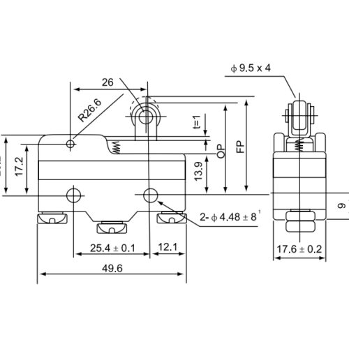 Micro switch fim de curso, Corpo baquelite, 15A/250V, acioamento tipo pino haste curta com roldana