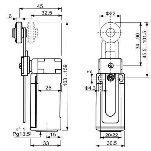 Chave fim de curso, corpo plastico, 2NF, 10A/250V, IP40, acionamento tipo haste regulavel c/ roldana plastica